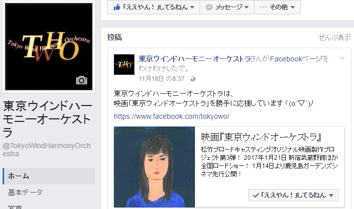 WEB管理者「楽団のfacebookページで映画東京ウィンドオーケストラのfacebookページをシェアしておきました!└(‘ω’)┘」