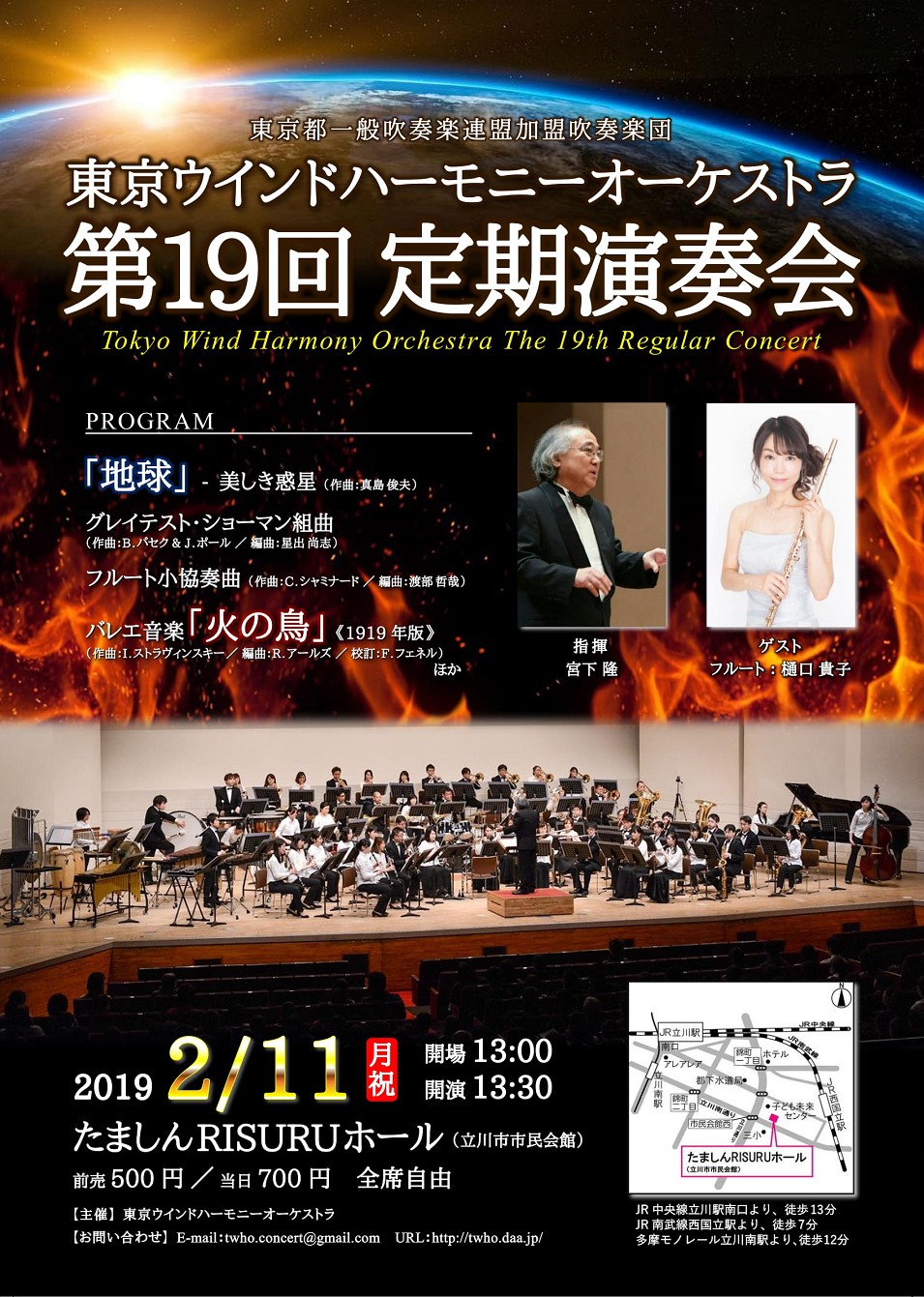 客演にフルート奏者の樋口貴子さんをお迎えして「フルート協奏曲」や、メインに難曲「火の鳥」など、盛りだくさんのプログラムとなっております!!